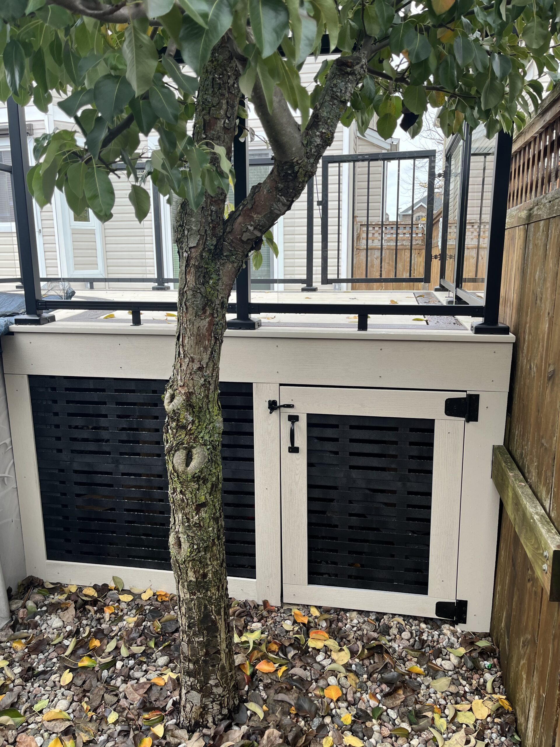 To add to this we customized some PVC horizontal jail bar lattice and framed it out with Clubhouse PVC decking. It’s the perfect pairing with the black aluminum railing.