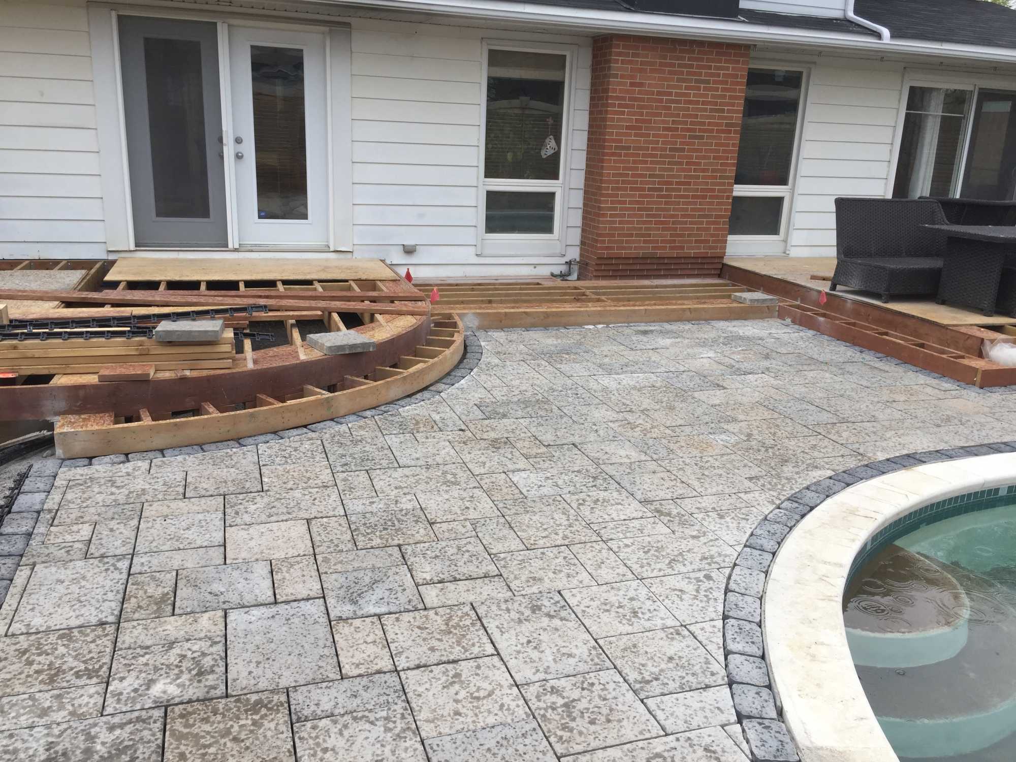 This backyard renovation features a curved composite deck, cedar fence, interlock pool patio along with soft landscaping